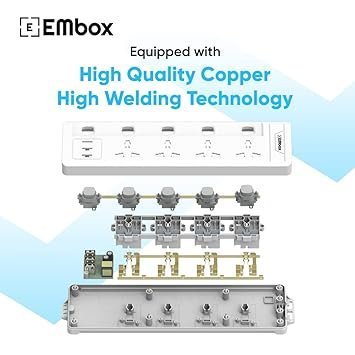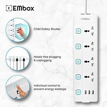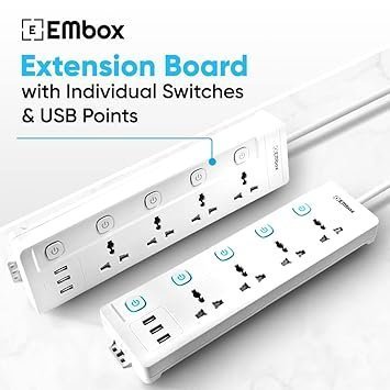 mos EMBOX 10A Extension Board with USB Port- 4 Universal Sockets and 3 USB (2.4 A) Charging Ports with Indicator, 2500W Heavy Duty Cable, 250 Volts (2 Meter Cable)